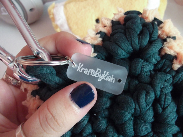 this funky star bag charm is handmade using dark green recycled t-shirt yarn, and fluffy peach yarn, finished with a heavy duty carabiner and KraftsByKiah frosted acrylic tag