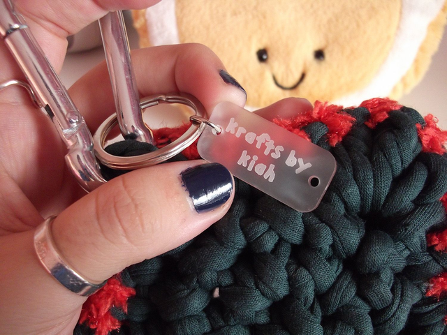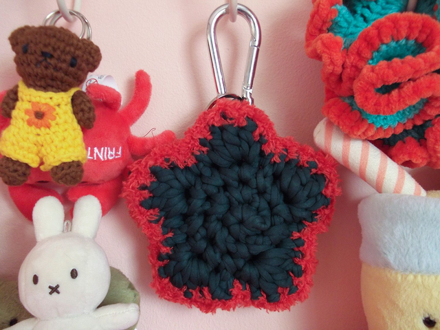 this funky star bag charm is handmade using dark green recycled t-shirt yarn, and fluffy red yarn, finished with a heavy duty carabiner and KraftsByKiah frosted acrylic tag