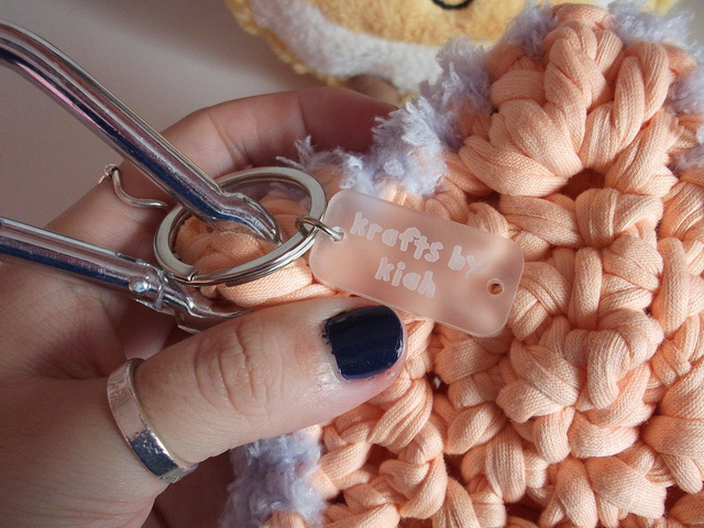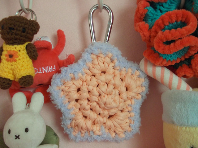 this funky star bag charm is handmade using peach recycled t-shirt yarn, and fluffy lilac yarn, finished with a heavy duty carabiner and KraftsByKiah frosted acrylic tag