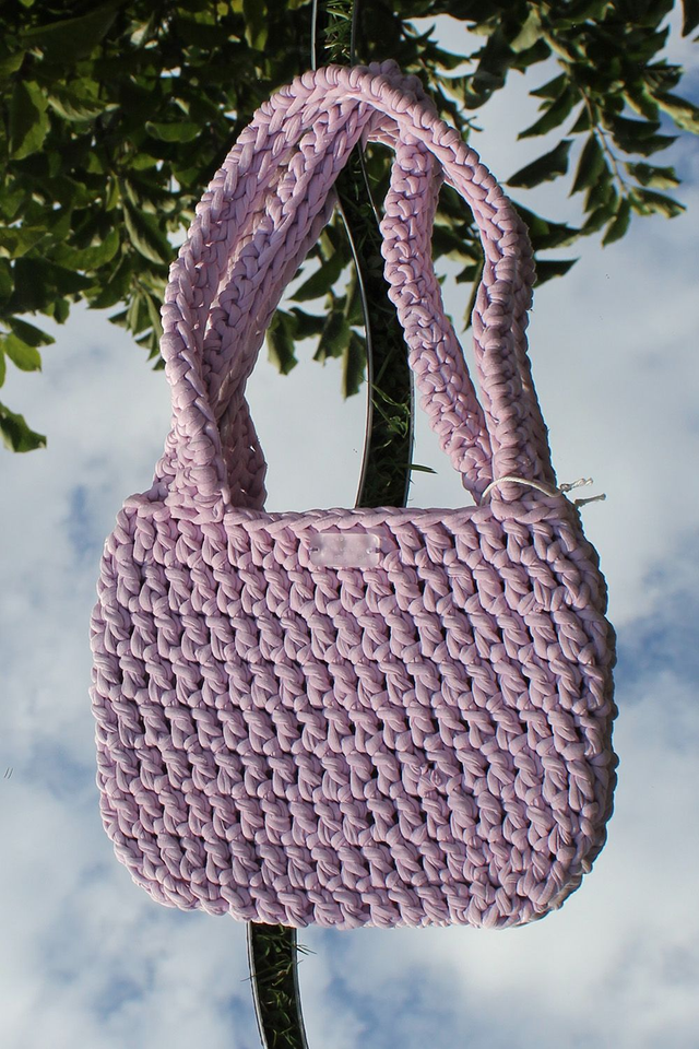 This completely unique shoulder bag is crocheted using chunky yarn made from recycled t-shirts!