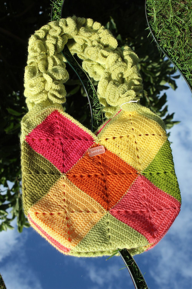 Crocheted using 100% acrylic yarn, and finished with a unique ruffle shoulder strap!