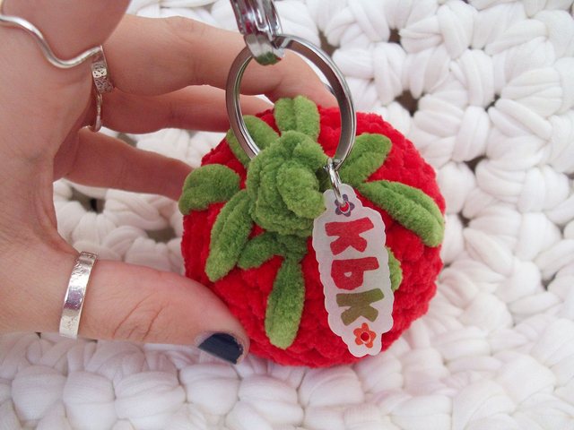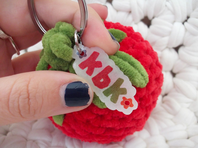 the cutest tomato bag charm handmade using red and green chenille yarns π