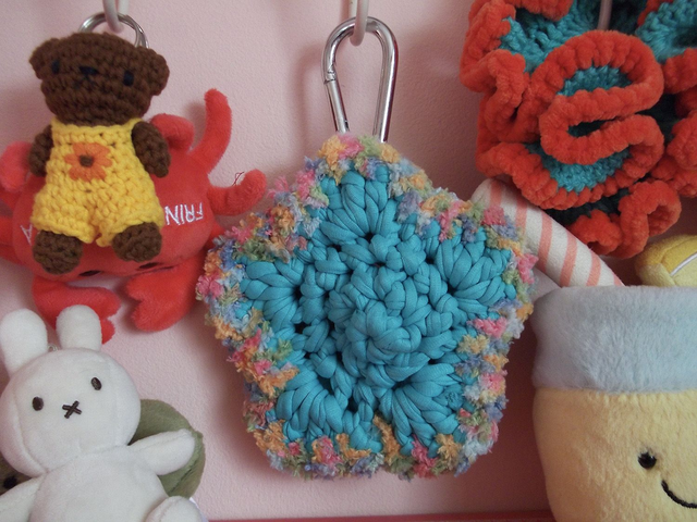 this funky star bag charm is handmade using turquoise recycled t-shirt yarn, and fluffy rainbow coloured yarn, finished with a heavy duty carabiner and KraftsByKiah frosted acrylic tag
